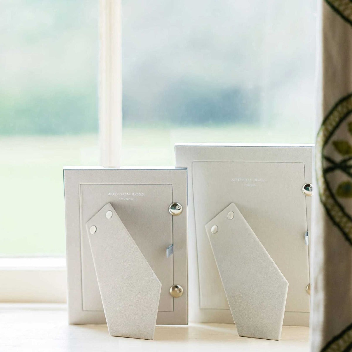 Able to stand landscape or portrait, this frame features a luxury dove grey velvet back. The sizing refers to the size if image within the frame, please allow on average 5mm overlap around the edge of your image.