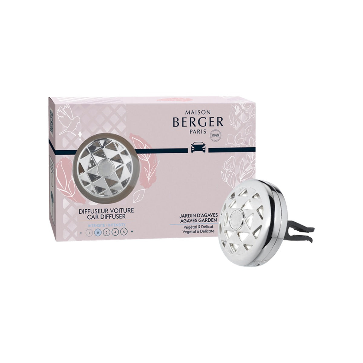 With this Joy Agaves Garden Car Diffuser, combining a round shape with graphic cut-outs, Sylvie de France has been able to express all her creativity. The cold and metallic aspect of the object is compensated by the presence of geometrical patterns in relief, transforming it into a precious jewel. The triangular shapes of which it is composed symbolise this delicate femininity, elegantly dressing your interior. Its interstices, sometimes full, sometimes empty, allow the perfume to diffuse easily into the air. Like a beautiful custom-made ornament, the Joy Agaves Garden Car Diffuser sparkles. This aesthetic accessory allows you to personalise your vehicle but it is also and above all functional. Once the scented ceramic is inserted into the space provided for this purpose, you will enjoy the vegetal notes of an Agave Garden. The floral scents of blue agave and white freesia are gently intertwined, accompanied by a warm woody base of sandalwood. Its intensity of 2/5 provides the right fragrance balance for your travels.