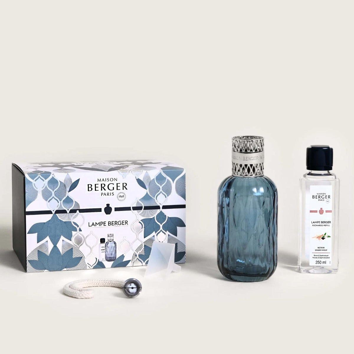 Part of an elegant collection, the Blue Quintessence Berger Lamp Gift Pack delicately describes the art of design by De Vog. Colored with a captivating blue, this Berger lamp combines heritage and modernity, reflecting an exceptional glass-making craftsmanship and innovative design. This creation by De Vog, where every detail counts, pays tribute to the artisanal tradition with authenticity and prestige.