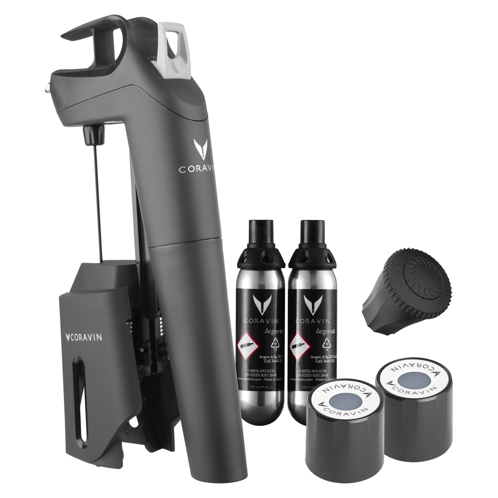 Featuring a durable, molded all-black design, it includes everything you need to begin your wine journey: two Coravin Pure® Argon Capsules, two Coravin Screw Caps, and a Coravin Aerator.