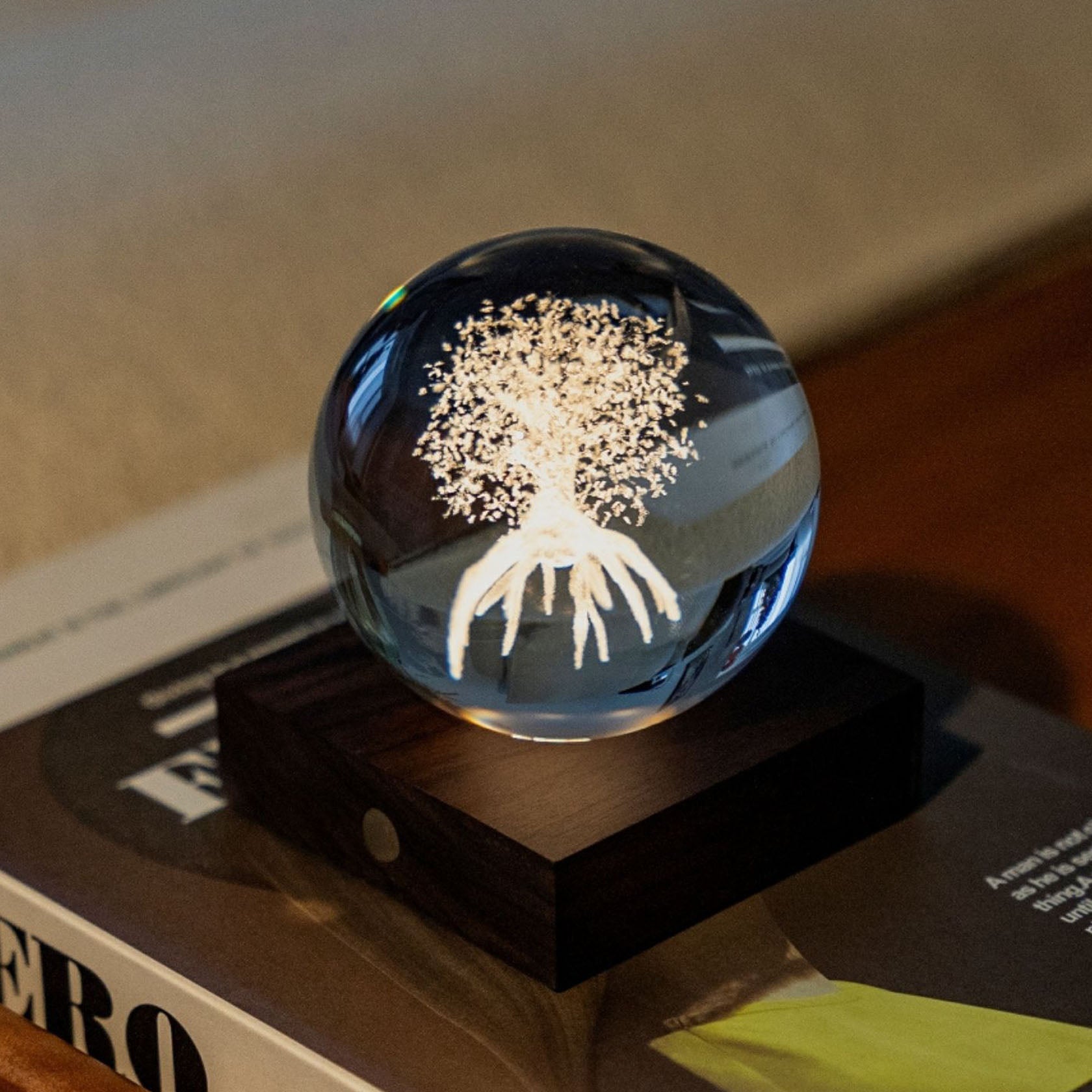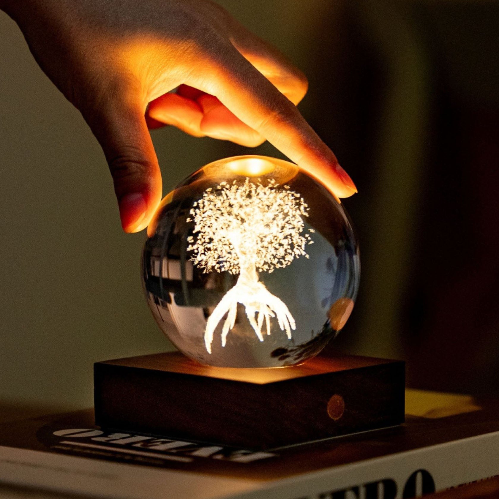 With a height of 12cm, the crystal ball pieces sit on natural walnut wood base to complement your interior design. You can switch between three light intensity levels by touching the copper button on the front of the solid natural wood base. The crystal is also polished to a shine that reflects light and creates a stunning effect in any room. The walnut base is fitted with a rechargeable battery that can keep your space illuminated with stunning light for up to 16 hours. The USB-C port in the back makes for easy charging.