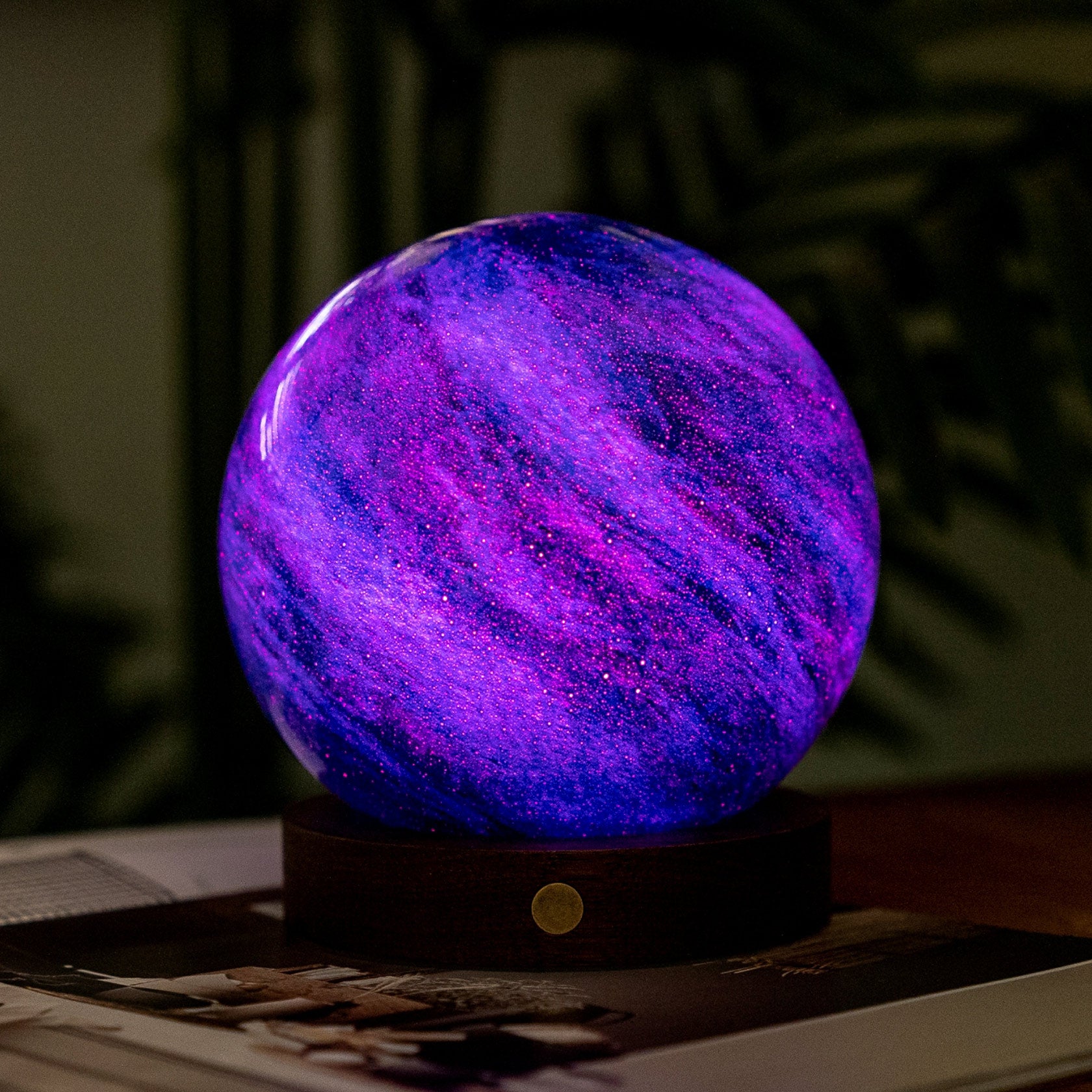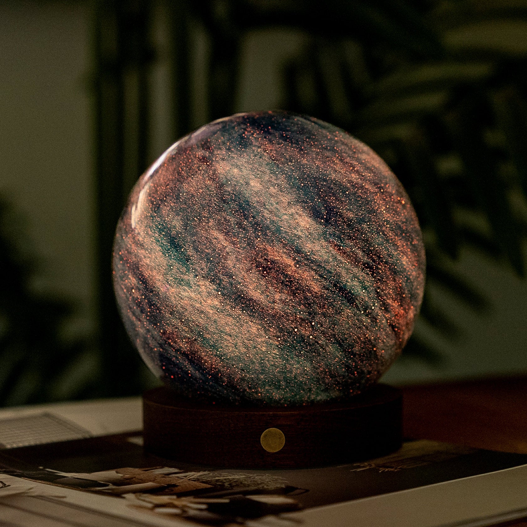 The lamp’s eco-friendly base, crafted from FSC-certified American walnut wood, complements its celestial design. It would fit right in with the dark woods of a library or even a bedside table. The hand-blown glass globe showcases artisanal craftsmanship, ensuring every piece is as unique as the stars themselves. A USB-C rechargeable port provides convenience, while a protective mat ensures your furniture remains scratch-free.
