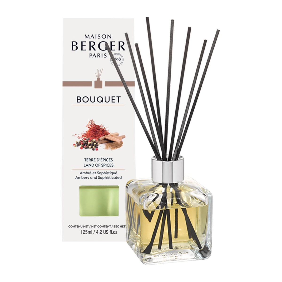 Whatever your decorative style, the Land of Spices scented bouquet adds a touch of elegant simplicity to your home. This return to basics is reflected in the use of the raw material. The transparent simplicity of the glass gives your room a little lightness and fluidity, while allowing it to retain a certain brightness. Playing with line and curves, the cubic shape is softened by rounded corners. This Land of Spices scented bouquet becomes almost invisible, making it possible to enhance the space and focus primarily on its purpose. Once the reeds have been soaked in the solution, the fragrance can begin to diffuse. The spicy notes of pink pepper and saffron combine with those of amber incense, creating a warmly sophisticated olfactory composition. This exceptional and captivating fragrance is a wonderful accompaniment and adds spice to every moment of your life!