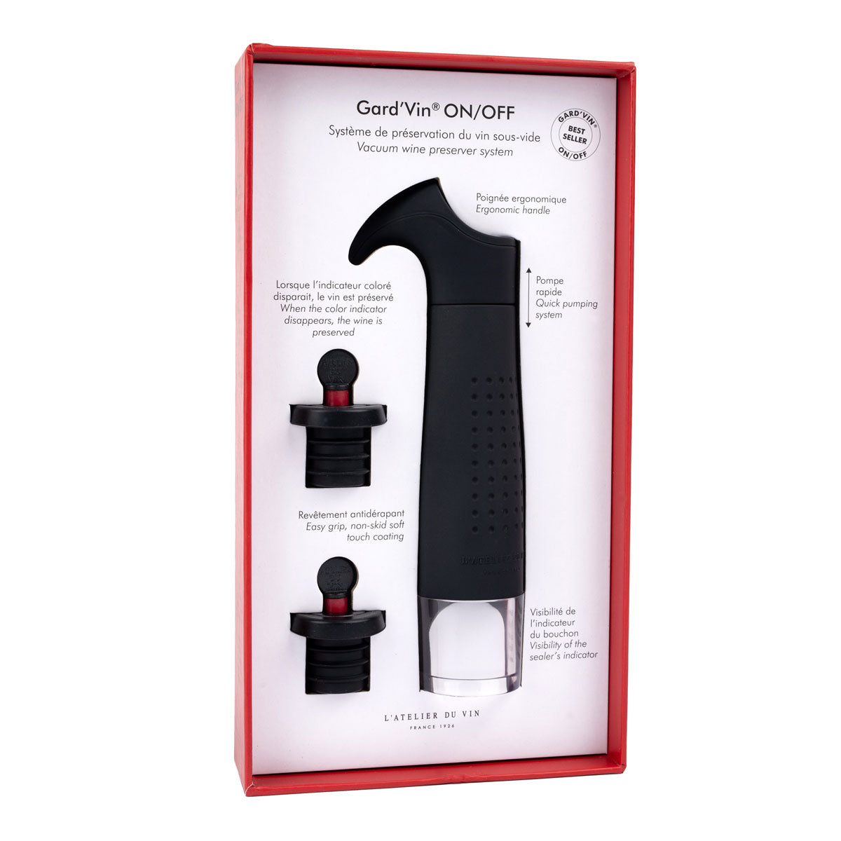 This top-of-the-range wine tool is as useful as it is attractive and has become a reference in the oenological world. Its air extraction system is the result of many years of research and constant improvement. The Gard’Vin On/Off vacuum pump is used by sommeliers, wine merchants, oenologists and wine lovers, as it extends the life of their most precious vintages.
