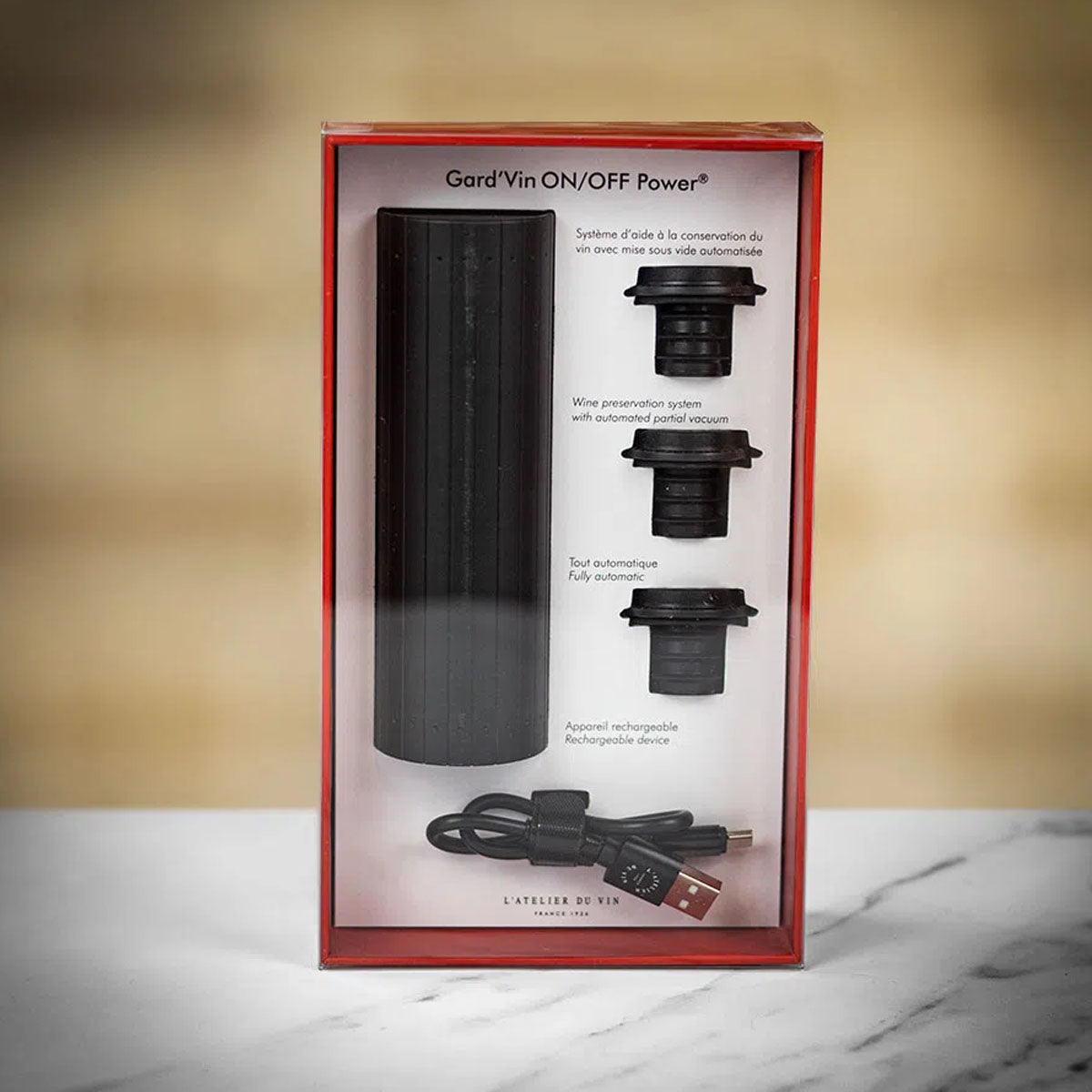 The go-to vacuum pump for wine connoisseurs, the Gard’Vin On/Off Power helps preserve fine wines for longer after opening and prevent them from turning before your next tasting session. It’s a precious ally and the perfect present for sommeliers, wine merchants, and anyone who is passionate about good wine.