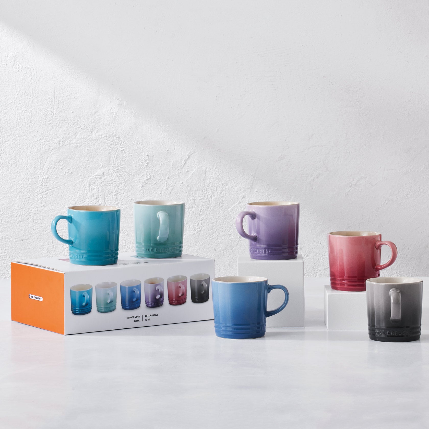 A set of six mugs in soft pastel hues, perfect as a gift or the ideal way to start collecting into the Le Creuset pastel colours of Teal, Sage, Chambray, Bluebell Purple, Rose Quartz and Flint. Presented in a premium colour box this set makes a great gift for those who love colour.