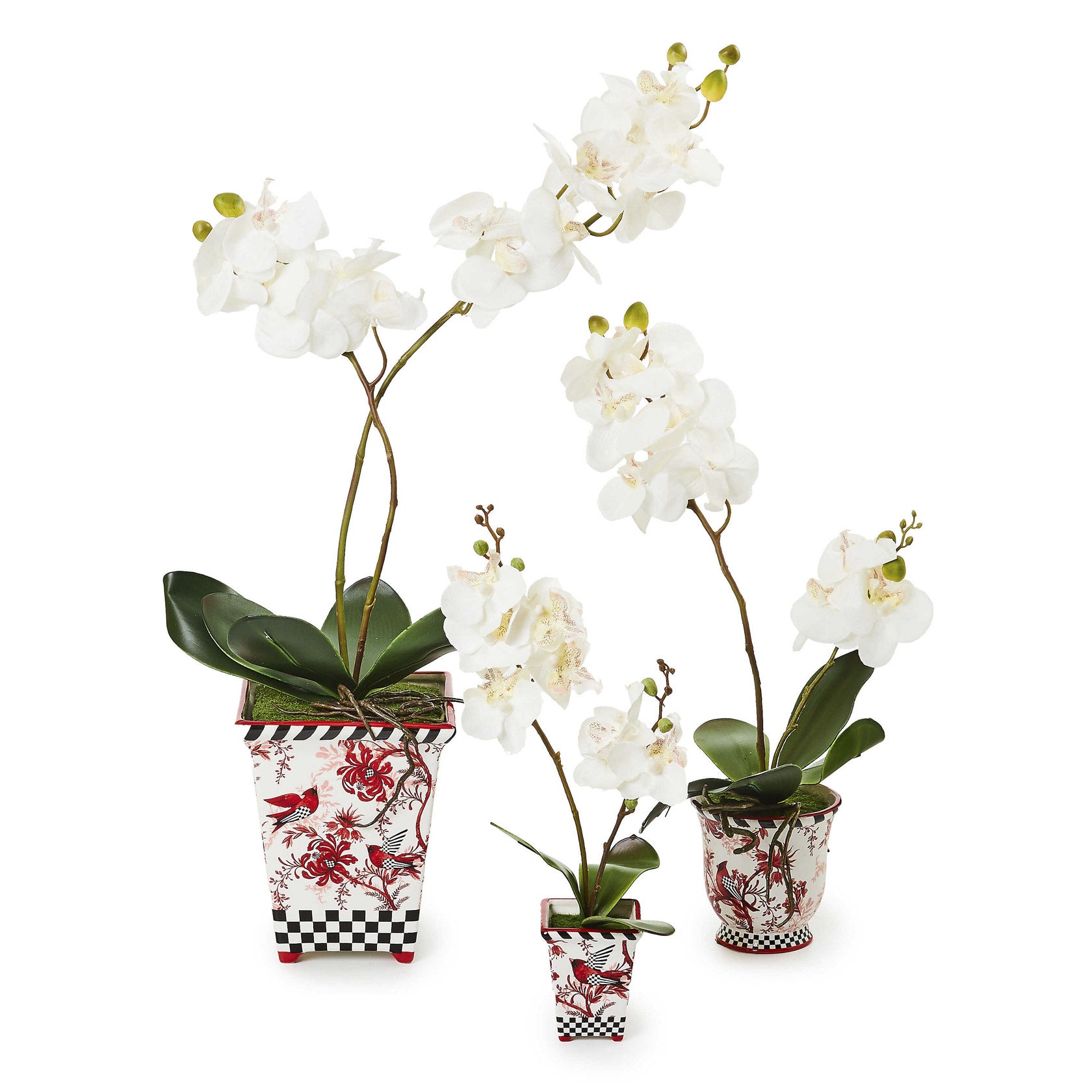 Anyone can “grow” this small everlasting orchid that’s potted in a ceramic pot, decorated with a red and pink cardinal and floral toile pattern that’s trimmed with black and white roping and Courtly Check.
