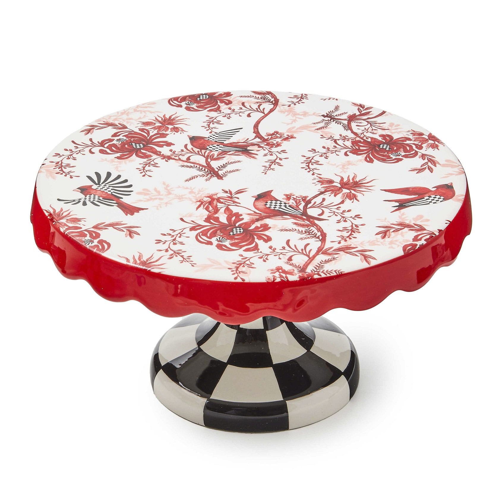 Serve holiday treats the merry and bright way on this small ceramic pedestal platter that’s decorated on top with a red cardinal and floral toile pattern and set on a base of black and white checks.