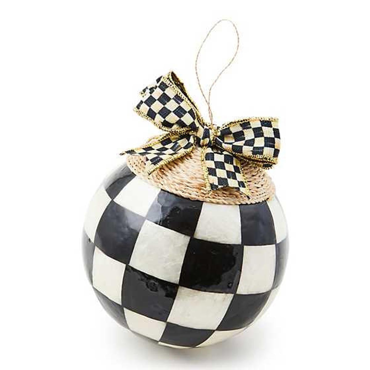 Deck your halls with a jumbo capiz ball ornament, featuring a hand-painted check pattern, topped with jute roping, and finished with a Courtly Check bow.