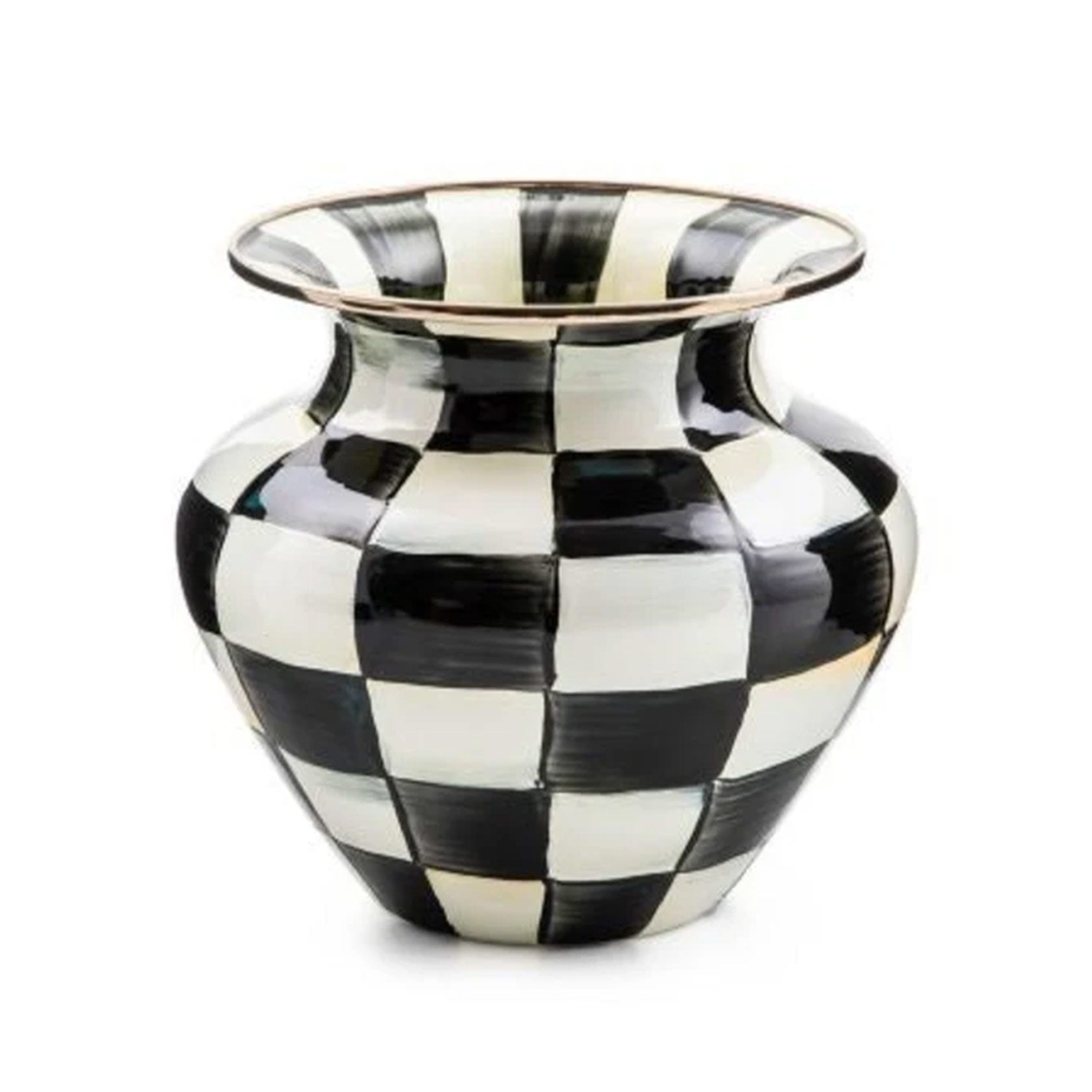 Petite and poised, for flowers, paint brushes, pencils (you might need more than a few!). The sturdy steel underbody of Mackenzie-Childs' Courtly Check Enamel Vase is adorned with hand-painted checks and rimmed in bronzed stainless steel.