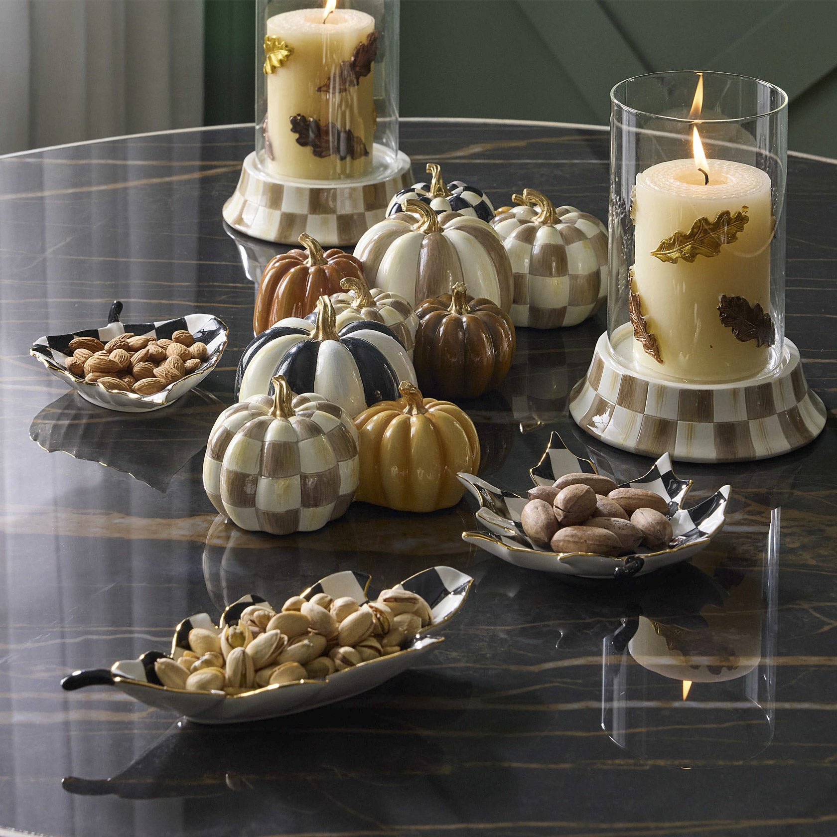 Bring the outdoors indoors with a dash of MacKenzie-Childs with this set of three leaf-shaped ceramic trays, featuring black and white checks and trimmed with gold lustre.