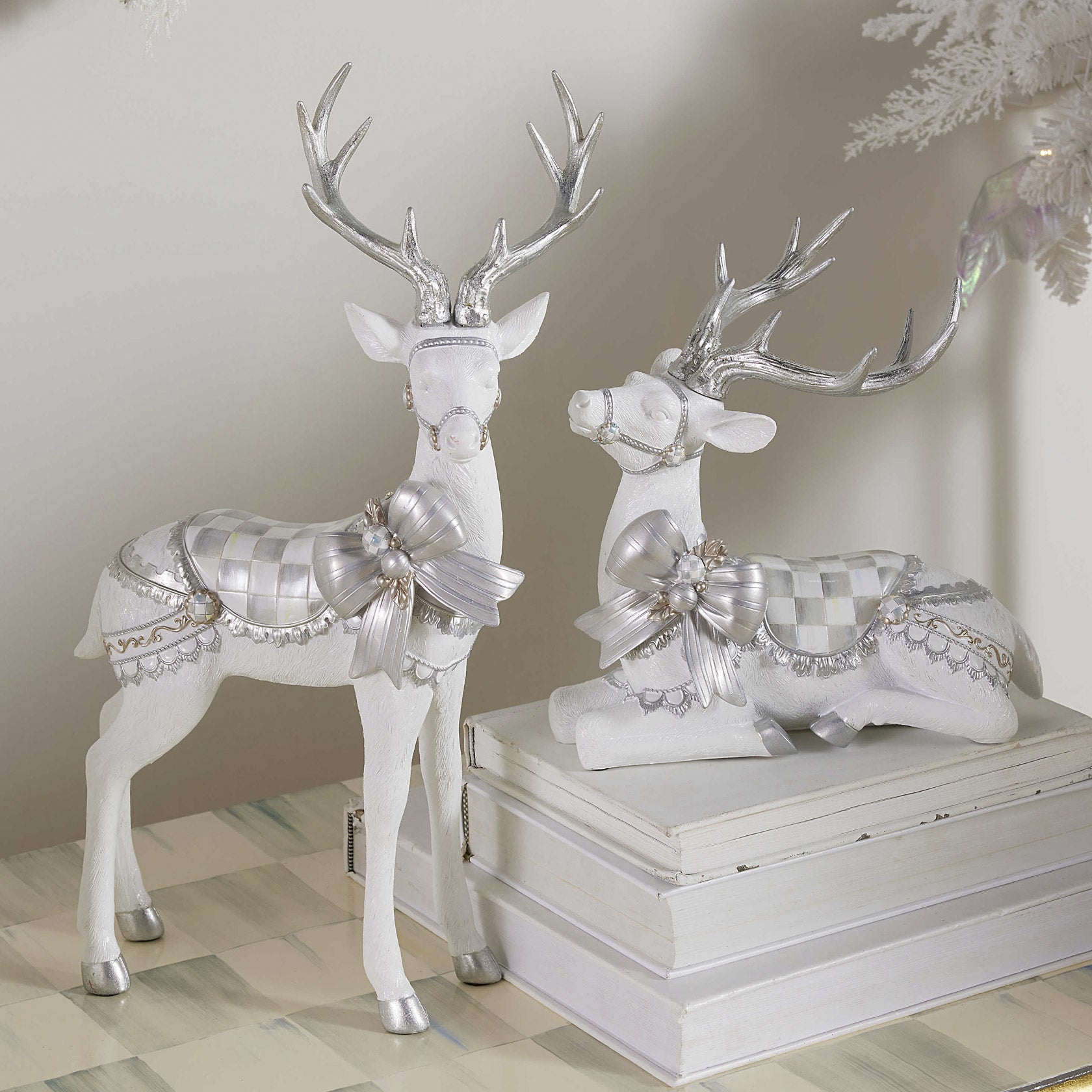 Deck the tabletops or the mantel with this wintry white resting deer that’s decorated with silver leaf hooves and antlers. It’s wearing a Sterling Check® saddle that’s embellished with silver ribbon and trims.