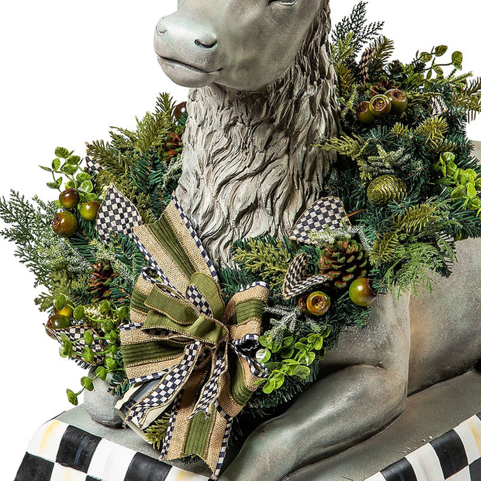 The Farmhouse Trophy Resting Deer is worthy of first prize, adding a fresh and festive touch anywhere it is displayed. Ideal to be placed in a sheltered outdoor location. Sitting on a base of Courtly Check, it has the look of patinaed carved stone. Wearing our everlasting Farmhouse Wreath, it's accented with a tin Courtly Stripe bell.