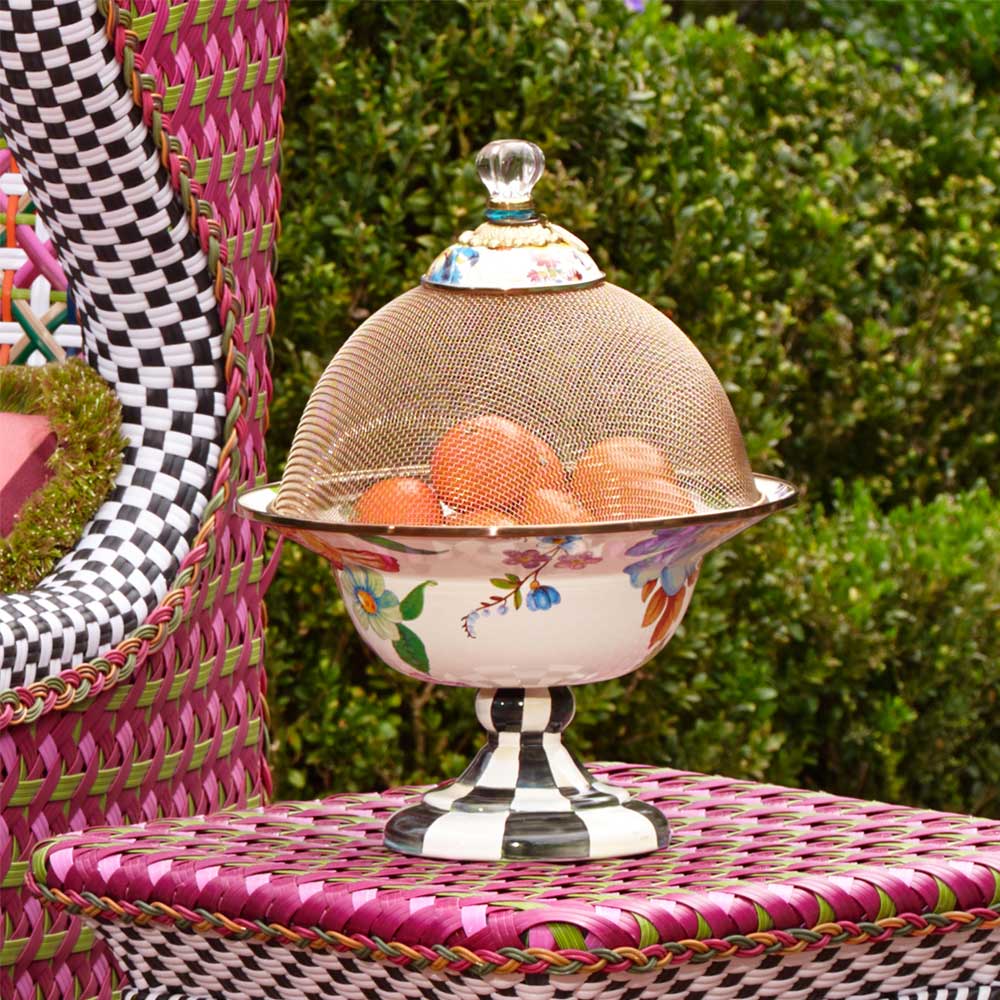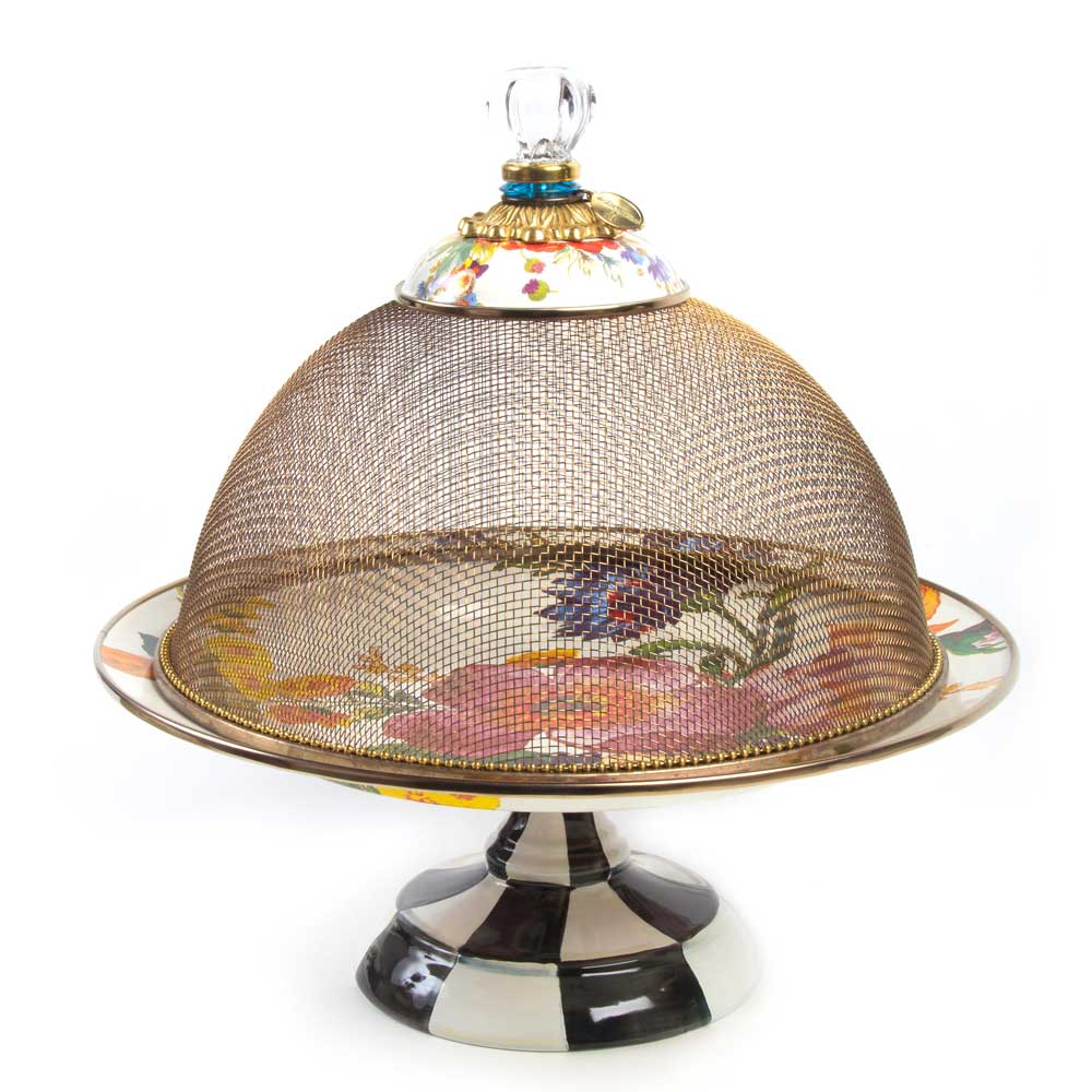 Dining outdoors has just become more pleasant. (Be gone, bugs.). Mackenzie-Childs' wire Small Flower Market Mesh Dome is banded in bronzed stainless steel, detailed with enamel and brass accents, and crowned with a glass knob. Designed to fit their enamelware chargers and small pedestal platters, and perfect for picnics.