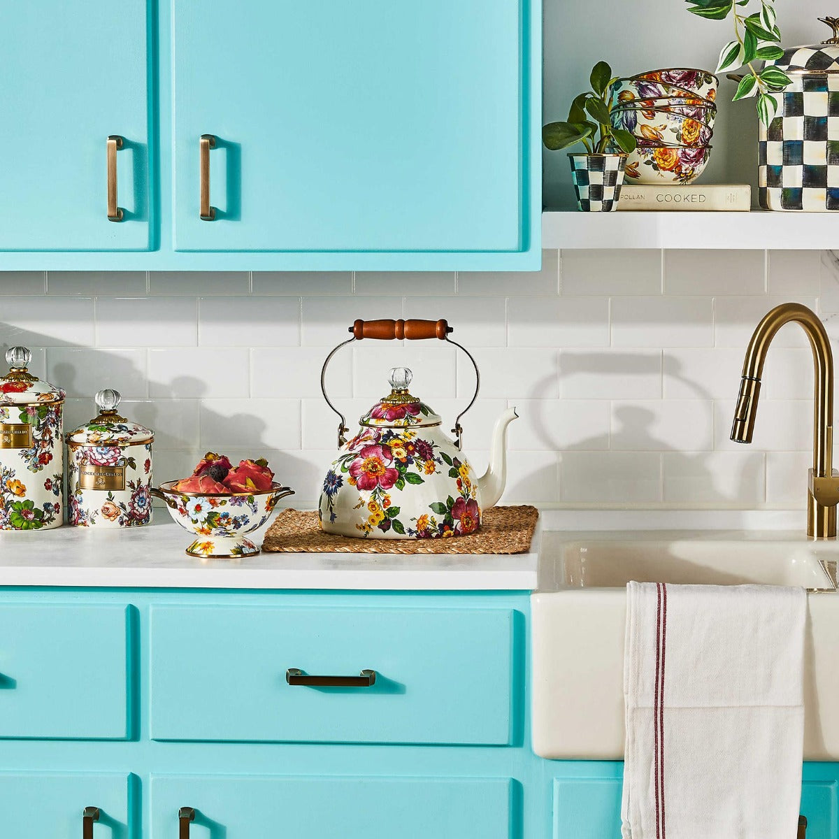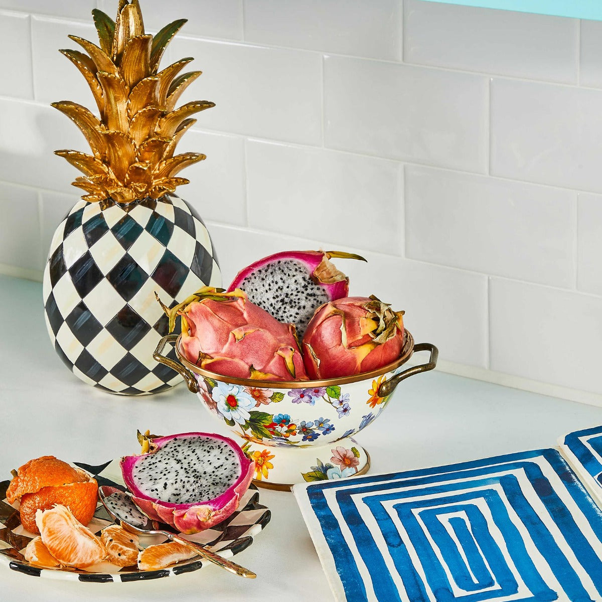 The White Flower Market Simply Everything Bowl is aptly named. The perfect size for holding fruit on the counter or serving side dishes, it's a must-have for parties and for everyday use, featuring a heavy-gauge, hand-glazed steel underbody with hand-applied floral transfers.