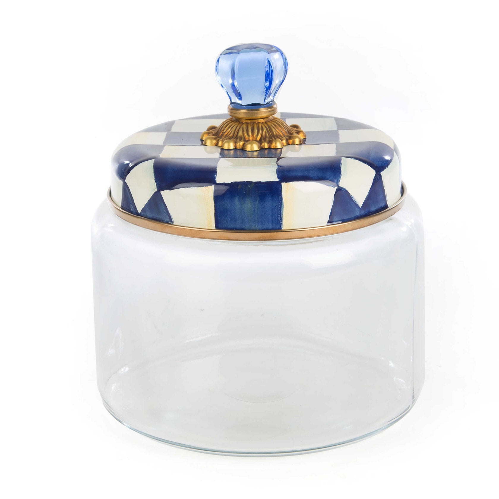 Keep countertops tidy in MacKenzie-Childs style with the Medium Royal Check Kitchen Canister. With Mackenzie-Childs' color-dragged check pattern in a range of blue hues on the hand-painted enamel lid, topped with a pretty blue glass knob, who could blame you for wanting to overhaul the whole pantry? Collect all the convenient sizes to hold countless contents.