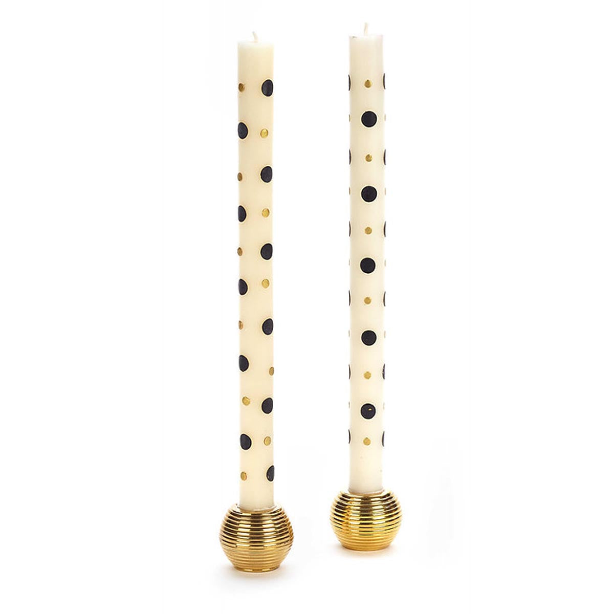 Turn your everyday meals into something more memorable with Mackenzie-Childs' Black and Gold Dot Dinner Candles. They feature a fun and fresh hand-painted pattern of polka dots in small gold dots and large black dots that add the glowing touch of MacKenzie-Childs to your dining table. This set of beeswax-blend candles will cast a lovely lustre on your table for up to 10 hours.