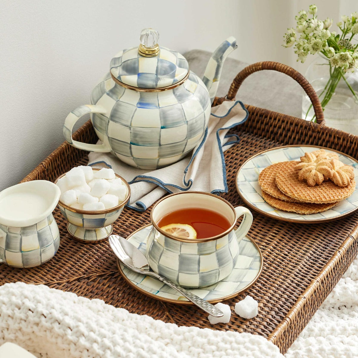 Dainty only in size, Mackenzie-Childs' hand-painted Sterling Check Enamel Little Creamer is a petite companion to their 4-Cup Teapot and Little Sugar Bowl.