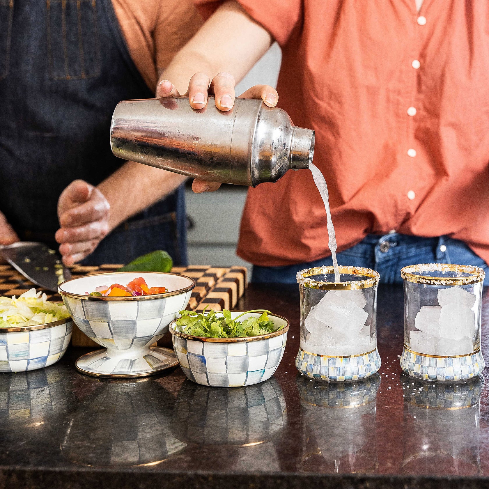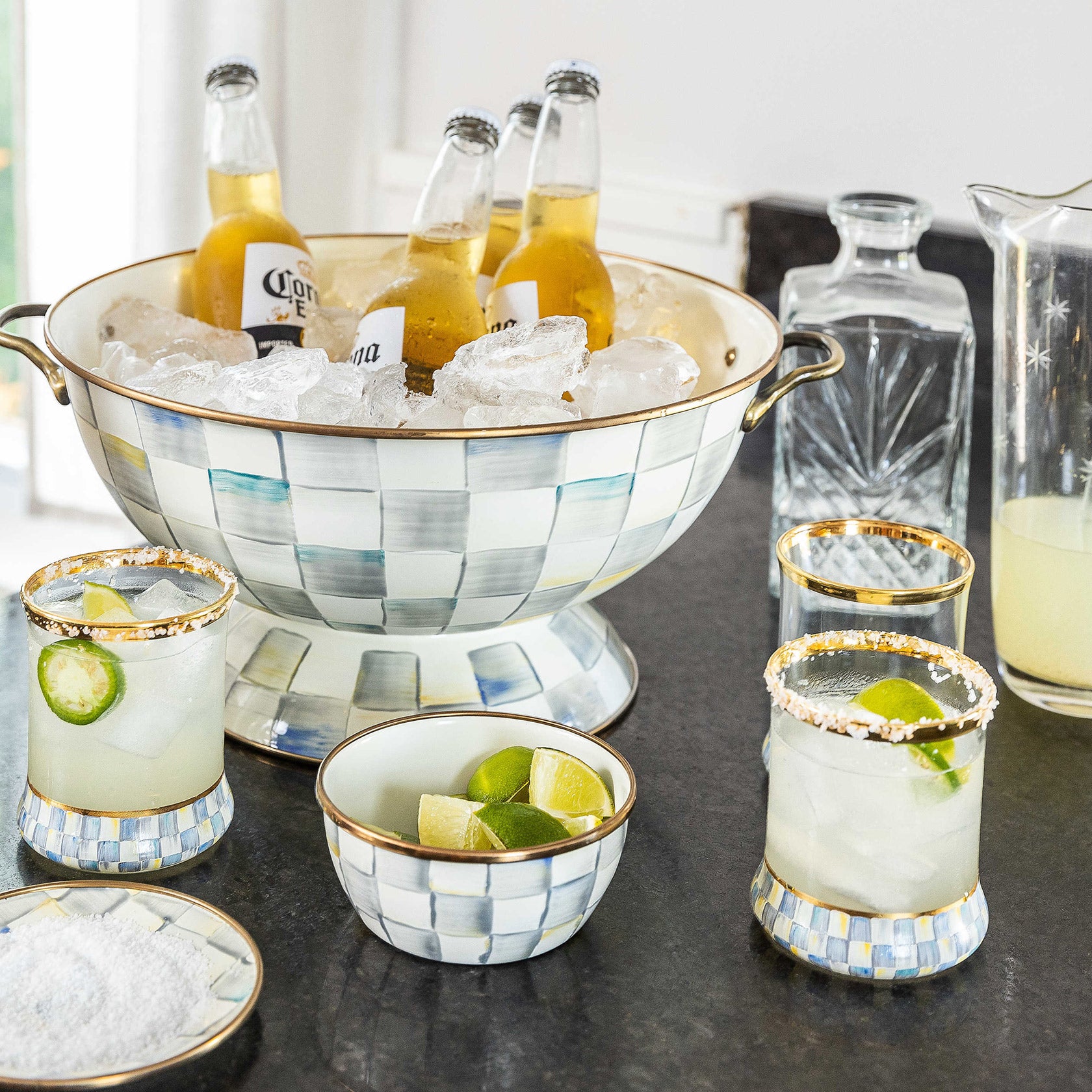 For masters of mise en place, Mackenzie-Childs' Sterling Check Pinch Bowl makes prep work a stylish snap. With its just-right size and our grey and white checked pattern, this petite enamel pot is equally charming when brimming with paper clips in a home office or lemon wedges on the wet bar. The heavy-gauge steel underbody is glazed with hand-painted, color-dragged grey checks that are similar in theme to their popular Courtly Check and rimmed in bronzed stainless steel.
