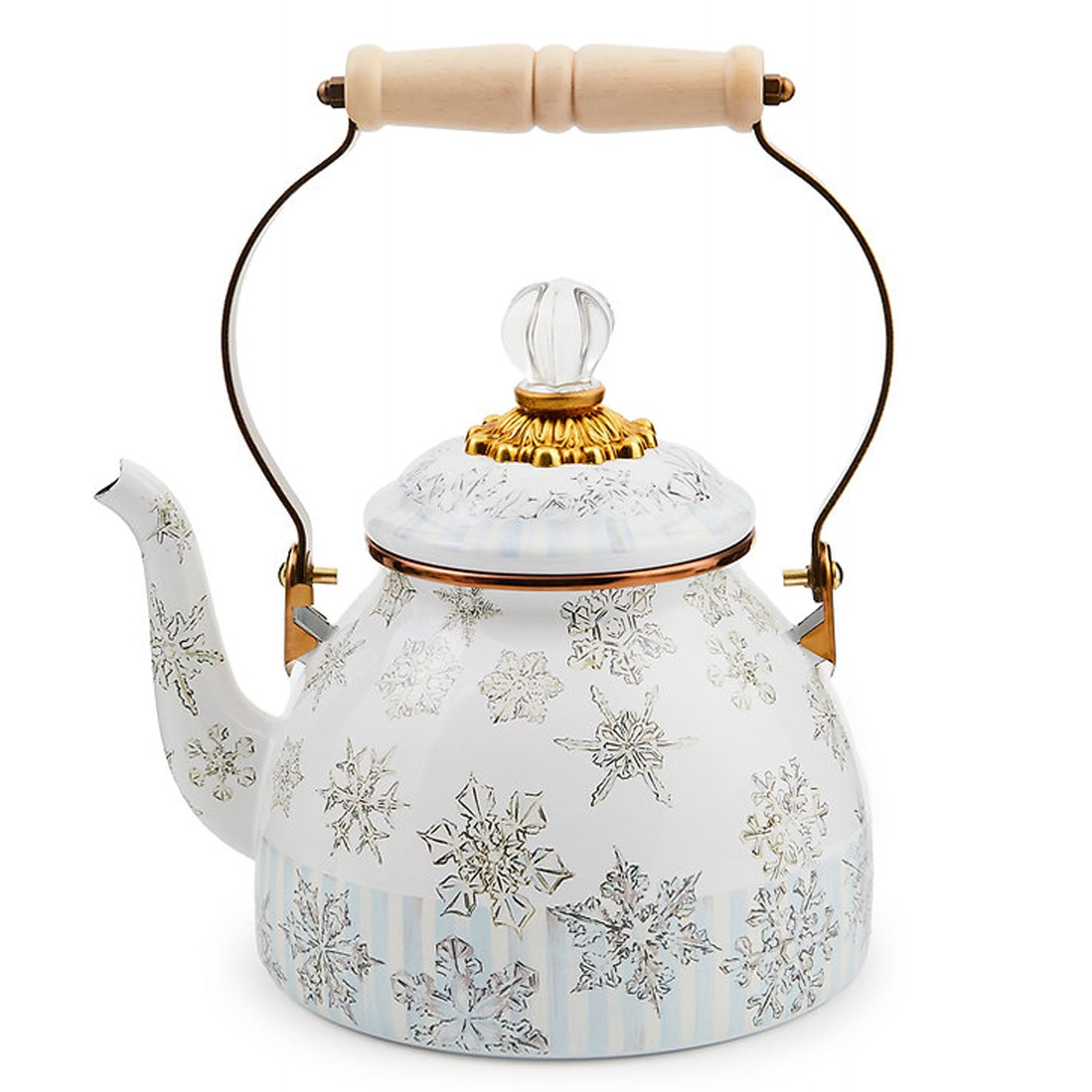 Suit your personali-tea with The Tea Kettle Collective. Embrace the wonder of winter with a warm cuppa served with the Winter Palace 2 Quart Tea Kettle. It features sparkling snowflakes on a heavy-gauge steel underbody, finished with a wood handle and a clear glass knob on the lid. Each special-edition Collective kettle makes a great cup of tea, of course, and adds MacKenzie-Childs style to your stovetop. Don?t be surprised that you need more than one.