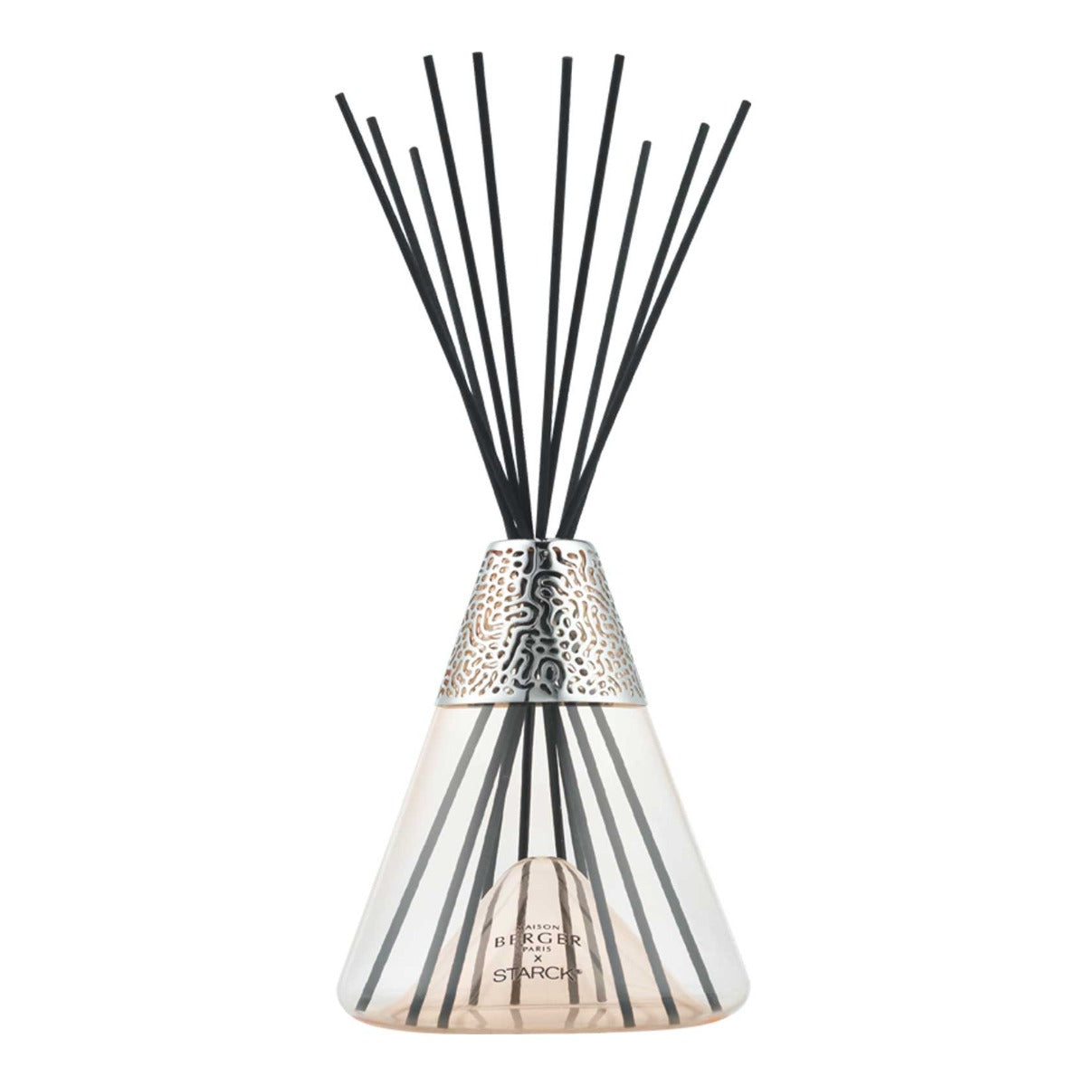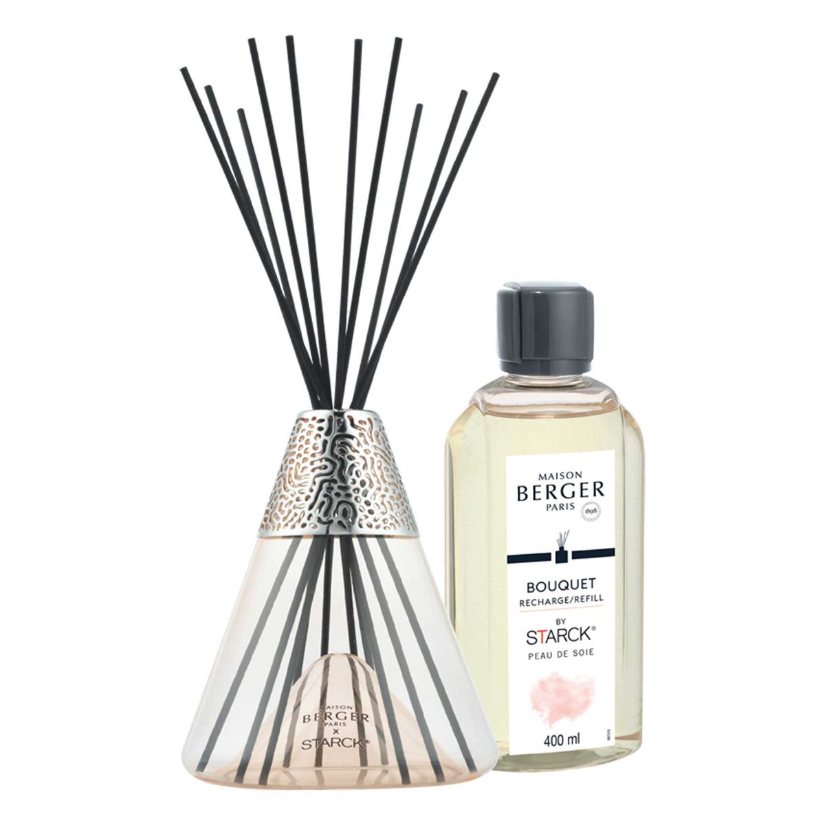 The Peau de Soie Scented Bouquet by Starck is imbued with femininity and modernity. The clean and timeless filigree lines of the collection are the result of a common vision, that of the designer Philippe Starck and Maison Berger Paris. The eye is immediately drawn to the unique conical shape of the object, reminiscent of laboratory glassware. Its originality resides in the manufacture of its base. The latter is domed, giving an impression of à ¢Ã¢â€š ¬Ã… ¡ ¬ÃƒÆ’†¦Ã¢â€š ¬Ã…“glass within glassà ¢Ã¢â€š ¬Ã… ¡ ¬ and a sensation of lightness. Whereas the metal ring and its organic motives sign the object. The Peau de Soie Scented Bouquet by Starck is in line with a minimalistic trend.