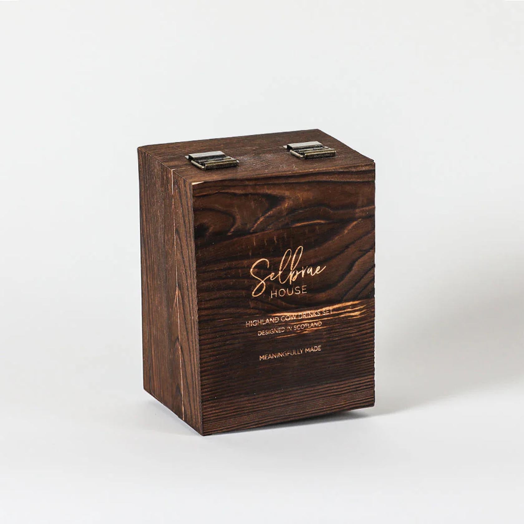 Experience Scottish charm with Selbrae House's Highland Cow-themed Drinks Set. The set includes a slate coaster, a classic glass tumbler and four whisky stones engraved with Highland Cows. Accompanied by a storage pouch for the stones and a pair of ice tongs, all items are elegantly boxed in a wooden Selbrae House gift box. An ideal gift for whisky lovers who admire the rustic beauty of Highland cows.