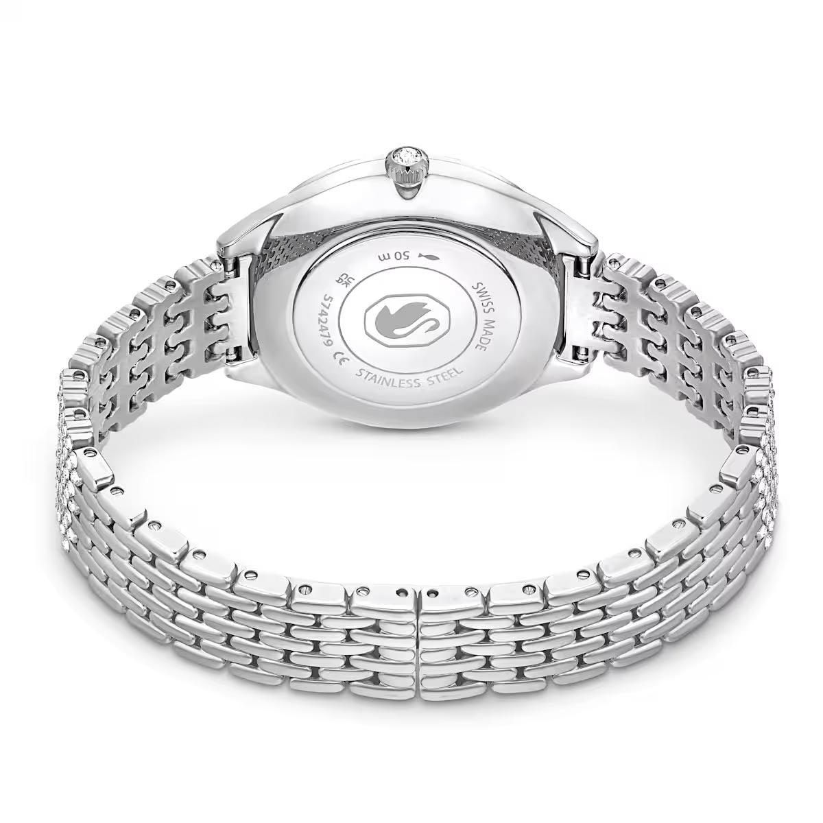 The simplicity of stainless steel has been beautifully lifted in this Swiss Made timepiece thanks to the compelling use of 433 crystals. On the silver tone guilloche dial, you’ll discover crystals for index markers, while the slender bezel and bracelet are each adorned with their own pavé of dazzling clear crystals. The 30mm watch is water-resistant to 50m and includes a single stone in its crown. The overall look is designed to make a subtle yet noticeable impact with any outfit you wear.
