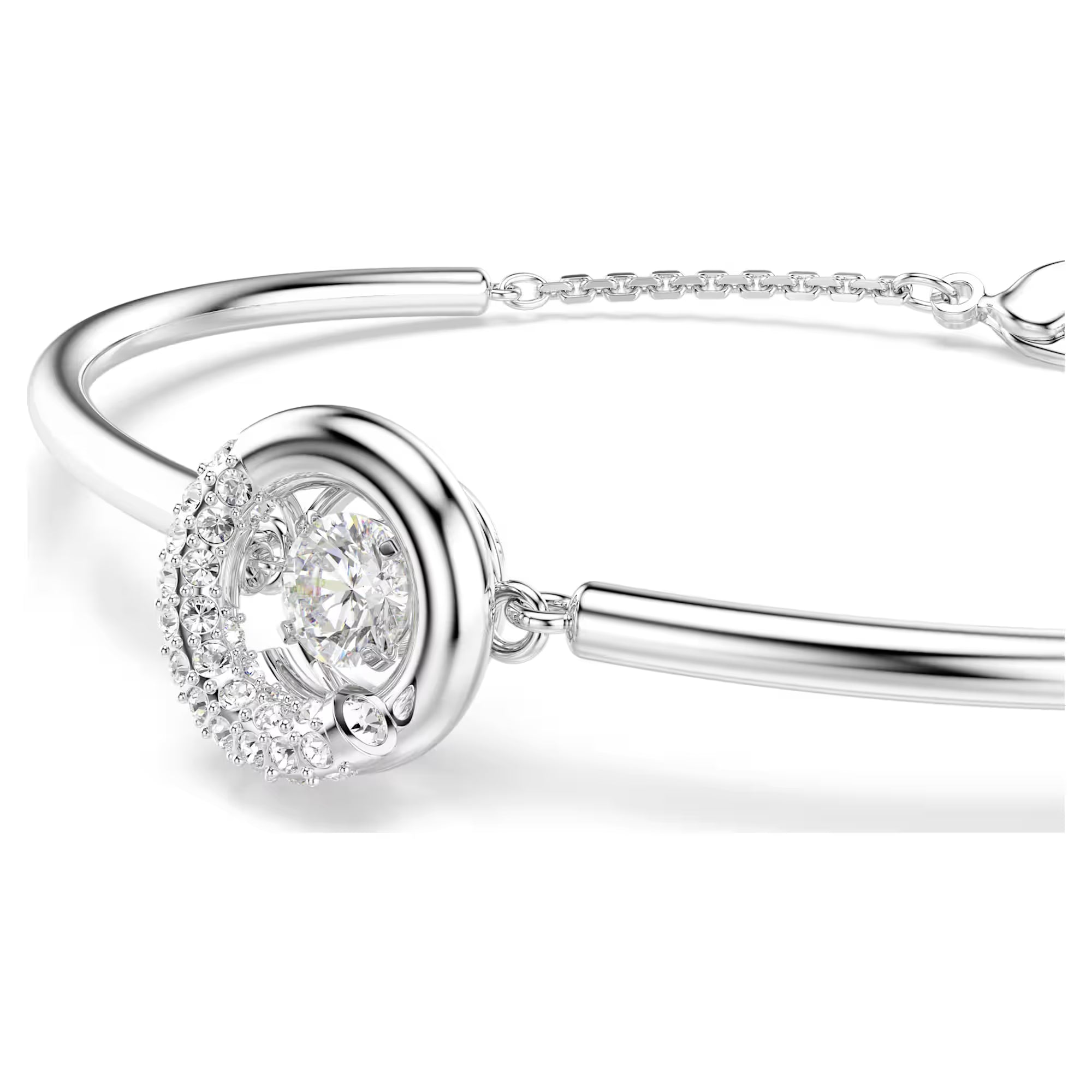 Channel the light with this stunning Dextera bangle. The rhodium plated design with lobster closure features a central hoop half encrusted with a pavé of clear crystals, and with a dancing Swarovski Zirconia placed in the centre. Wear with a matching pendant to radiate joy.