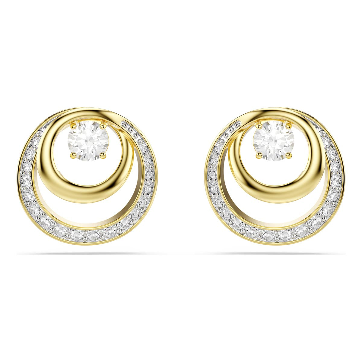 Embrace the circular style of these gold-tone plated Hyperbola earrings. Each hypnotic piece features a central Swarovski Zirconia surrounded by metallic spirals and glittering pavé. Wear them with a matching necklace or a ring to emphasize the modern sophistication.