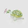 Graceful and nurturing, this mother tortoise figurine is depicted with a delicate pink daisy in its mouth. The design is precisely crafted with 1,577 facets, masterfully showcasing the tortoise’s elaborate shell. Along with a mix of green and yellow shades, the creation also reveals a flower stem in glossy green lacquered metal. Decoration object. Not a toy. Not suitable for children under 15.