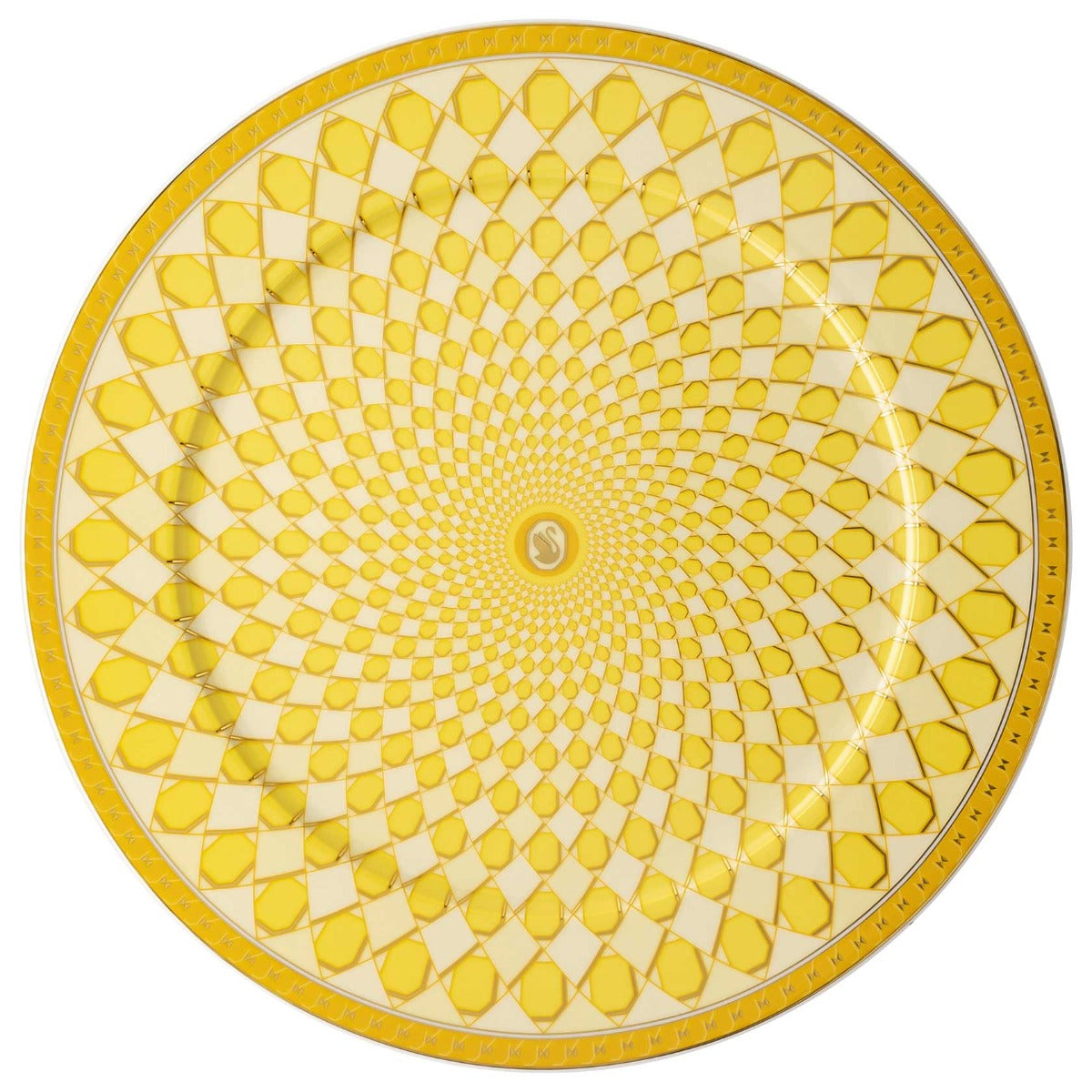 This bold and playful service plate brings pleasure to the art of the tablescape. The bright yellow motif is inspired by Swarovski's signature octagon and the iconic swan logo sits at the center in gold tone. Style it with other pieces in the Signum collection for a colorful feast. This plate is part of an exclusive collaboration with porcelain brand Rosenthal.