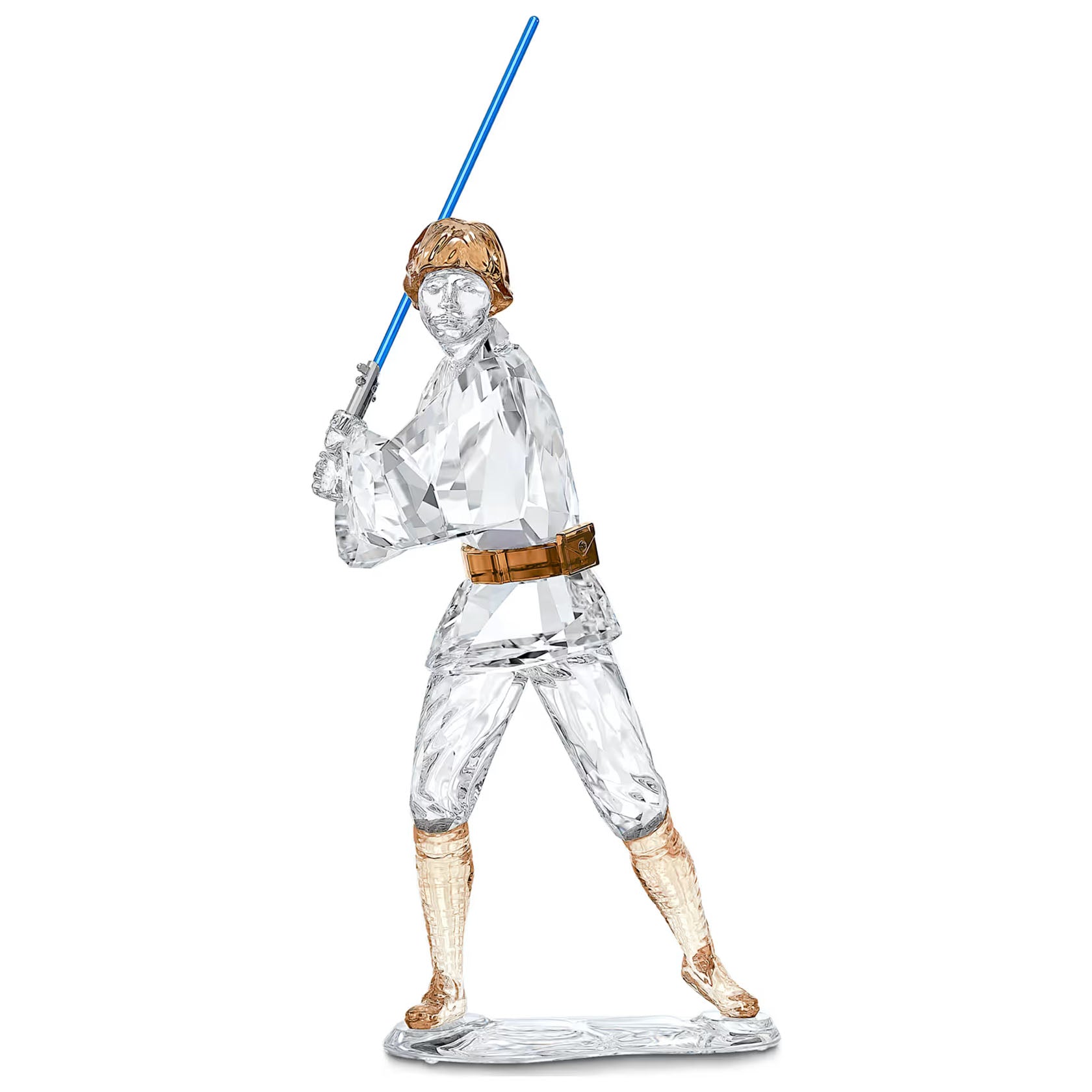 This detailed Swarovski figurine is a gleaming interpretation of a famous hero from the Star Wars universe. It portrays Luke Skywalker in 411 expertly worked facets of sparkling crystal, from his beige boots to his blond hair and brown belt. His famous lightsaber is depicted in an authentic shade of brilliant blue lacquer. Luke stands in a battle-ready pose on a clear crystal base. A fantastic gift that will delight any Star Wars fan, and a must-have for serious collectors. Decoration object. Not a toy. Not suitable for children under 15.