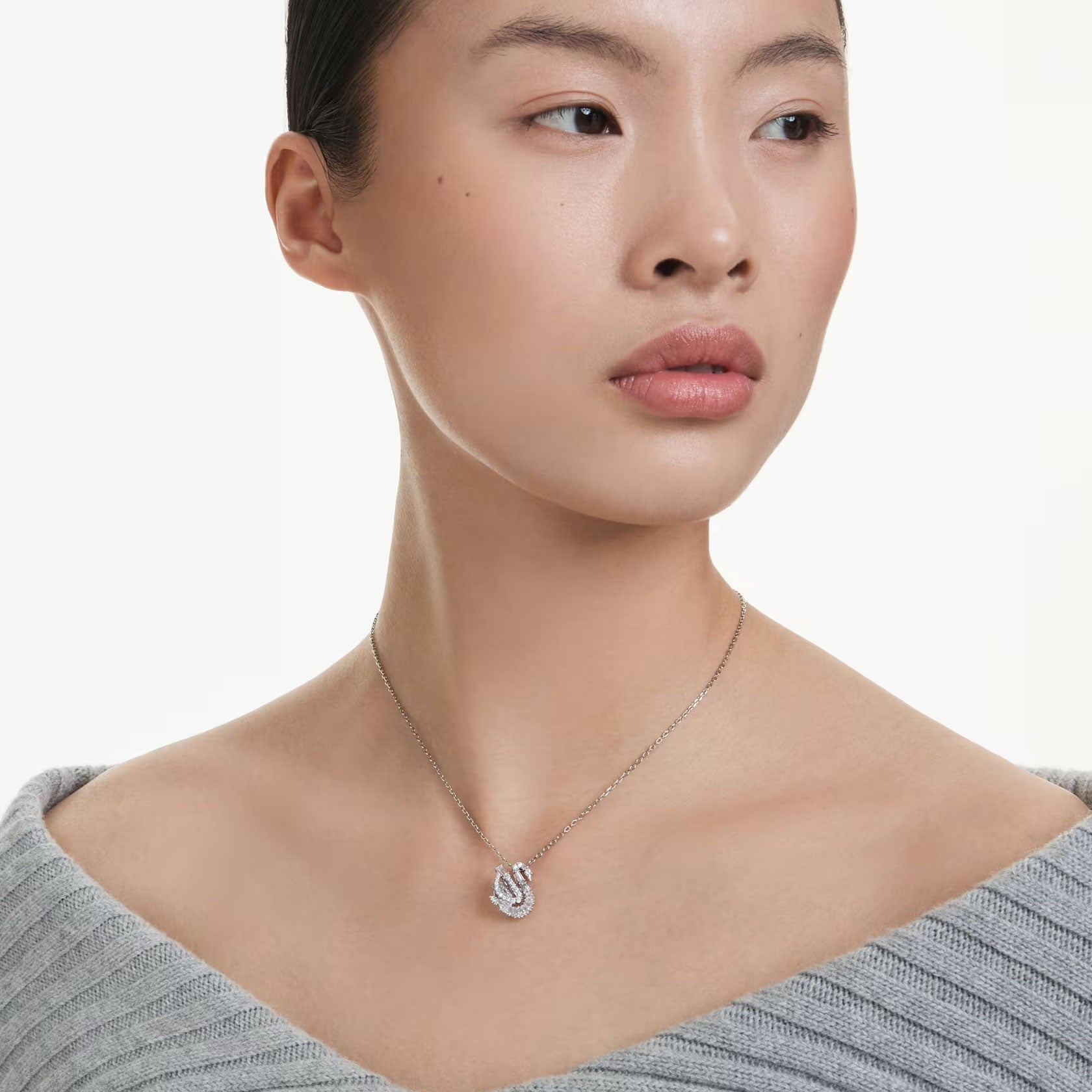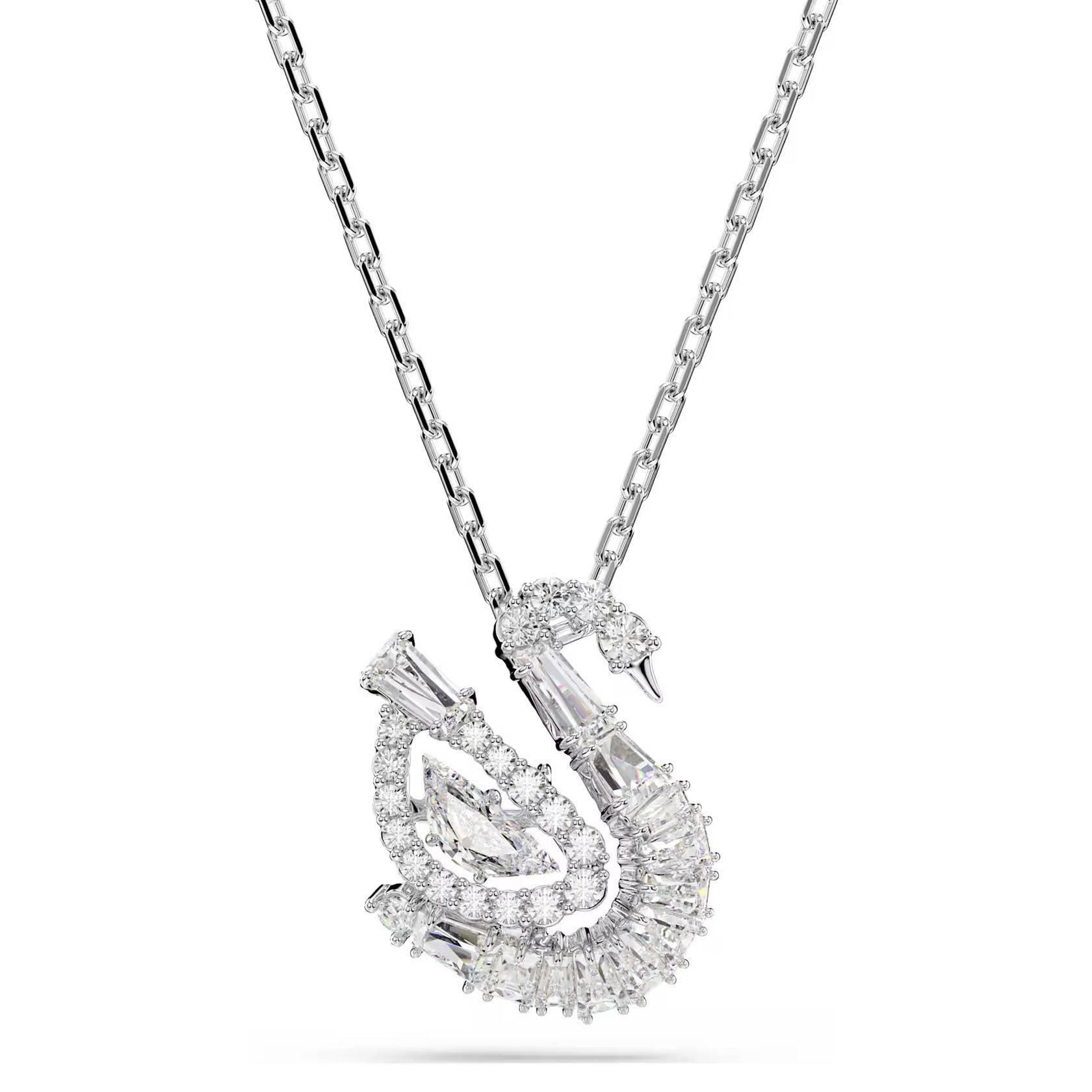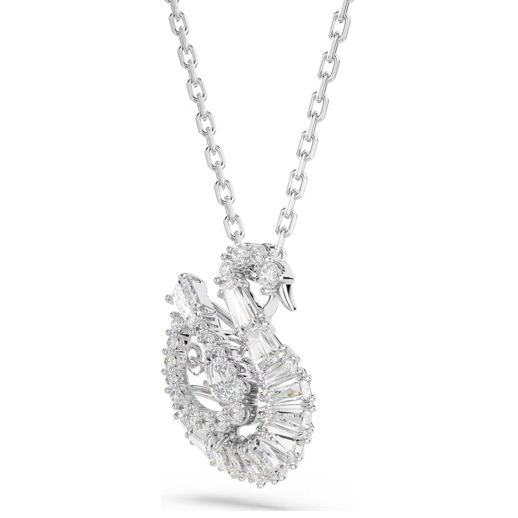 This pendant conveys the graceful movement of Swarovski’s iconic swan. Suspended from a rhodium plated chain, the central motif reveals an elegant silhouette, adorned in Swarovski Zirconia and with a clear dancing stone in a swan body cut. This radiant detail creates an endless motion of light, and will keep your style shining at every moment.