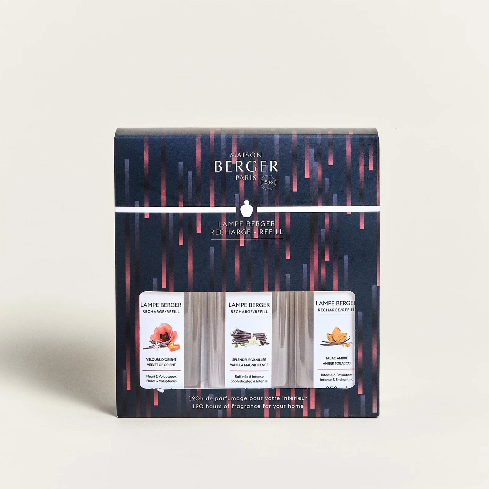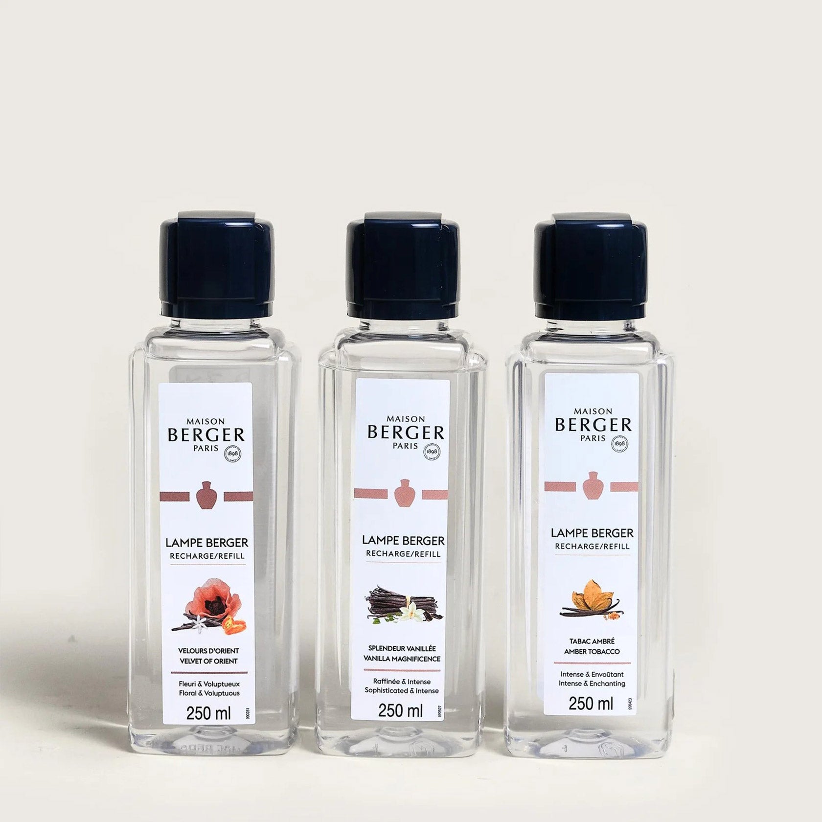 Replenish your lamp berger with a sensory trilogy of Vanilla Magnificence, Amber Tobacco, and Velvet of Orient, offering a diverse and opulent olfactory journey.