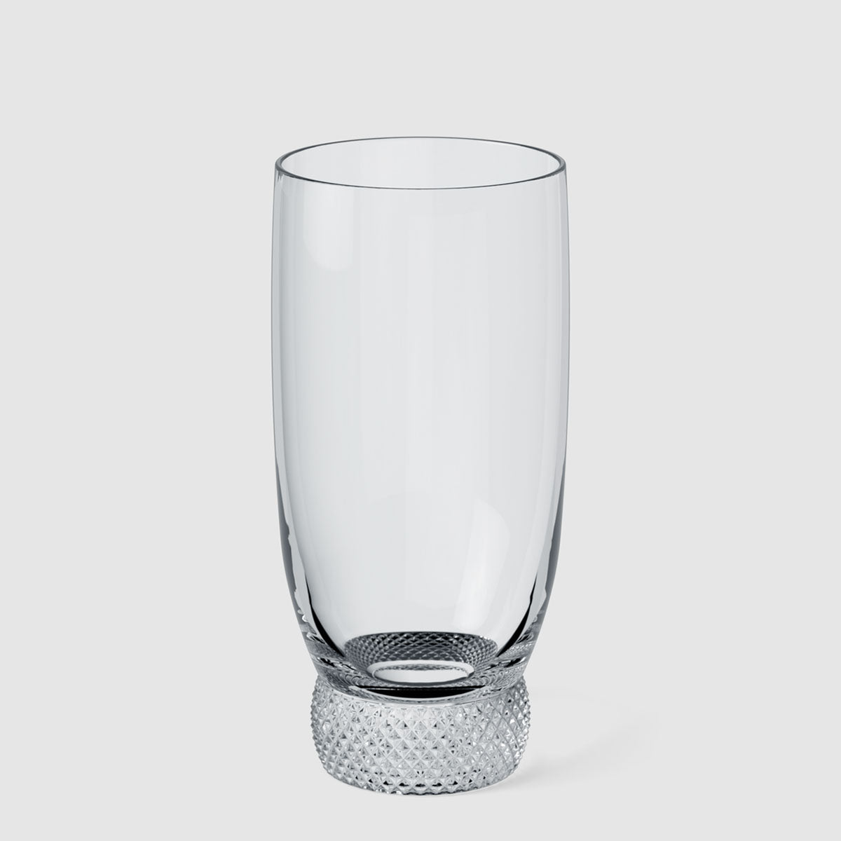 Striking simplicity and meticulous detail combine in this fine crystal stemware. Adorned with an intricately cut crosshatch design where the stem meets the glass, these pieces add an understated elegance to any occasion.