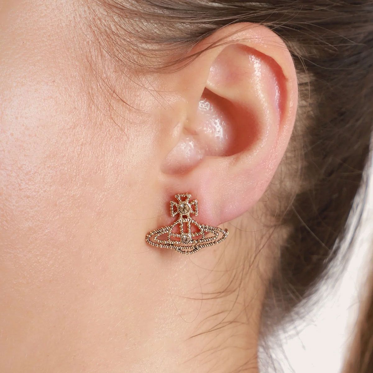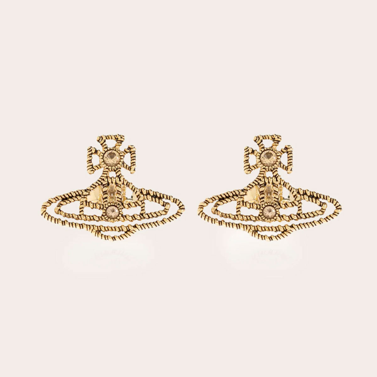 The Coretta Earrings by Vivienne Westwood capture refined elegance with their iconic planetary design. Crafted from high-shine golden brass, they feature a rope-like texture and a central off-white stone, blending timeless sophistication with signature Westwood artistry.