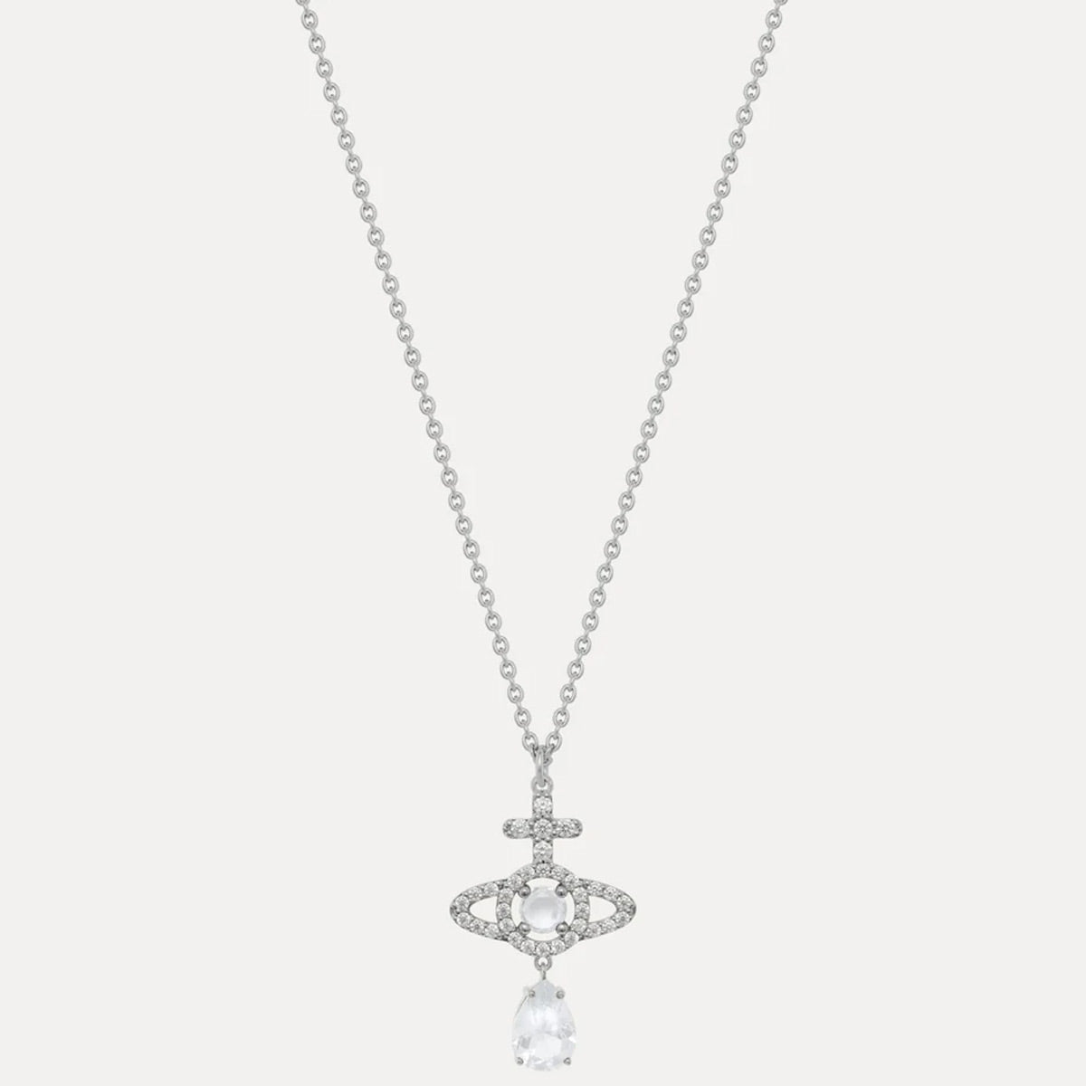 The Vivienne Westwood Olympia CZ Drop Pendant is a glamorous addition to your jewellery collection. The pendant features the iconic orb, embellished with glistening cubic zirconia and is finished with a dazzling pear-shaped CZ drop