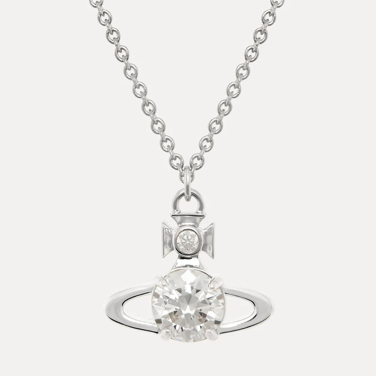 A feminine design, encrusted with glistening cubic zirconia, the Vivienne Westwood Reina Large Pendant is the perfect addition for any Vivienne Westwood fan. The necklace features the iconic orb in the centre of the design and is available on a delicate trace chain which has a lobster clasp for easy closure.