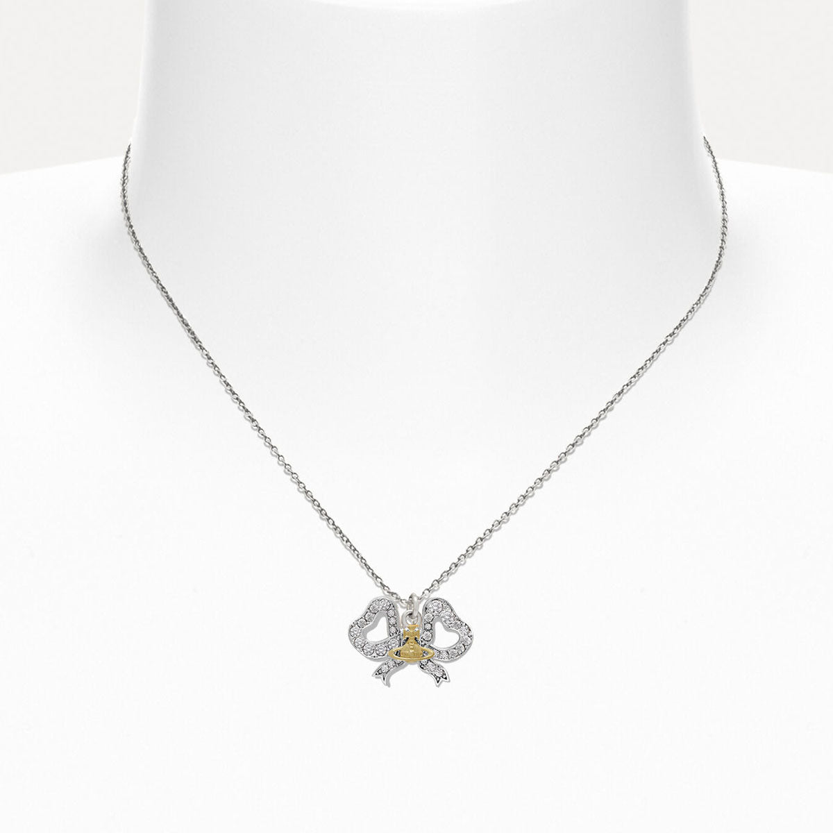 Vivienne Westwood's Rigoberta Pendant necklace features an intricate, Georgian-inspired butterfly bow charm, an essential element of the house’s iconography. The piece offers a polished, silver-toned silhouette, complete with a contrasting orb motif at the centre of the design, symbolising the house's ethos of connecting the past to the future.